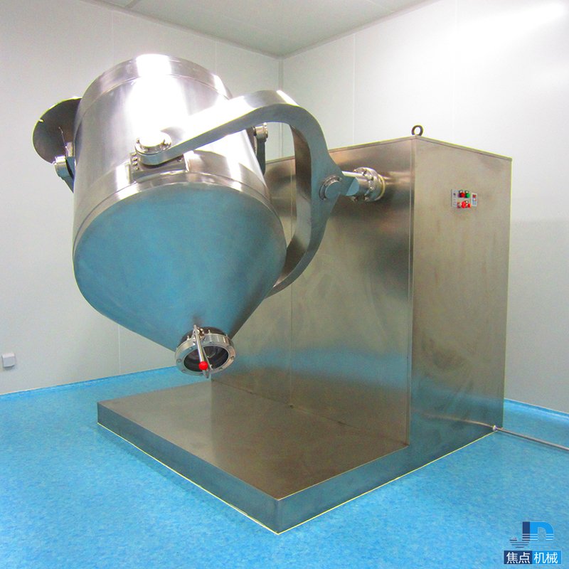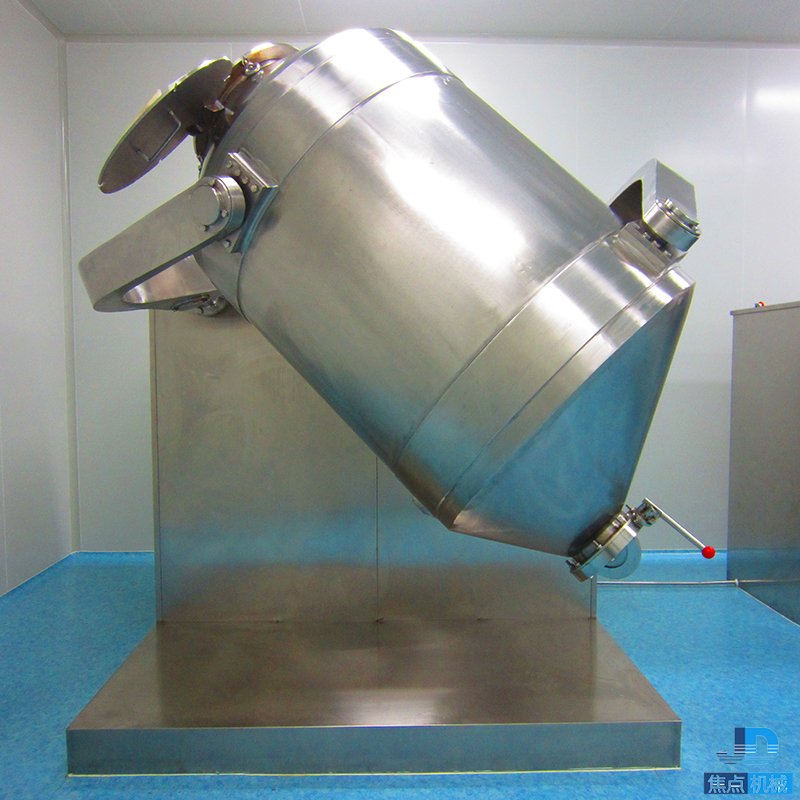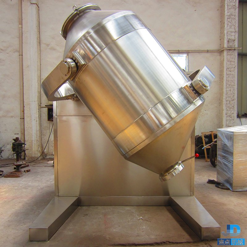 該機由機座、驅動系統(tǒng)、三維運動機構、混合筒,變頻調速電機,進料口出料口,電器控制系統(tǒng)等組成,與物料直接接觸的混合筒采用優(yōu)質不銹鋼材料制造,筒體內壁經(jīng)精密拋光。