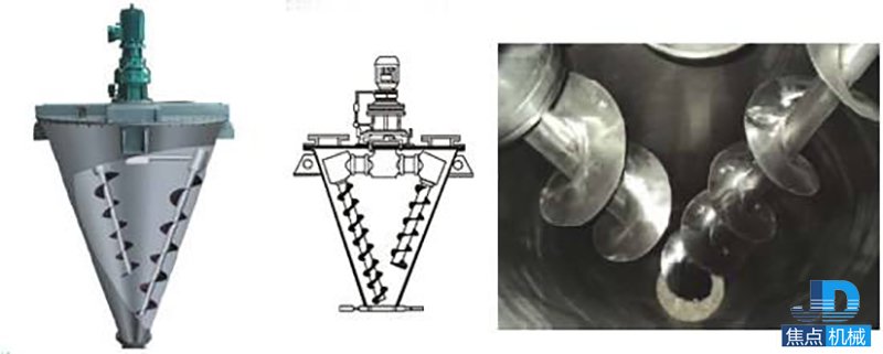 DSH系列的錐形混合機(jī)筒內(nèi)兩只非對(duì)稱螺旋自轉(zhuǎn)將物料向上提升,轉(zhuǎn)臂慢速公轉(zhuǎn)運(yùn)動(dòng);使螺旋外的物料,不同程度進(jìn)入螺柱,從而達(dá)到全圓周方位物料的不斷更新擴(kuò)散,被提到上部的兩股物料再向中心凹穴匯合,形成一股向下的物料流,補(bǔ)充了底部的空缺,從而形成對(duì)流循環(huán)的三重混合效果;標(biāo)準(zhǔn)型錐形螺旋混合機(jī)有兩根攪拌螺旋,實(shí)際應(yīng)用中根據(jù)設(shè)備規(guī)格大小可以采用單(一根長(zhǎng)螺旋)、雙(長(zhǎng)短各一兩根不對(duì)稱螺旋)、三(兩短一長(zhǎng)對(duì)稱布置)根螺旋;理論上攪拌螺旋越多,混合效果越好;設(shè)備一般采用梅花狀“錯(cuò)位閥”,此閥與長(zhǎng)螺旋底部貼合緊密,有效減少混合死角,驅(qū)動(dòng)形式有手動(dòng)和氣動(dòng)可選;根據(jù)用戶需要,也可加裝蝶閥、球閥、星形卸料器、邊出料等。