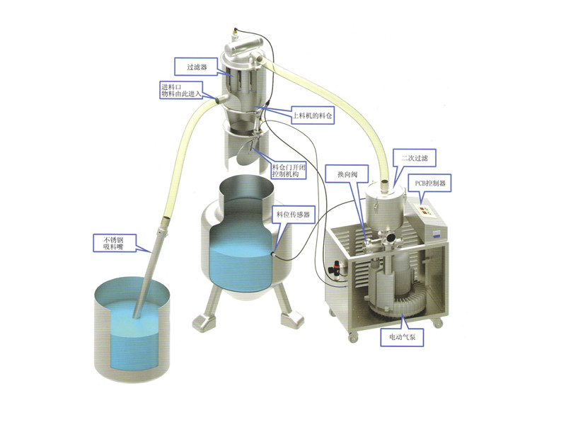 電動(dòng)真空加料機(jī)由電動(dòng)氣泵產(chǎn)生真空即負(fù)壓,這樣真空加料機(jī)將通過輸料管從儲(chǔ)料倉中將物料吸入上料機(jī)料倉內(nèi),再經(jīng)過過濾器將氣物分離,上料時(shí)間由PCB控制器決定,吸料結(jié)束,氣動(dòng)開閉機(jī)構(gòu)將料倉門打開將物料放入相關(guān)的設(shè)備中,反吹裝置將反吹吸附在過濾器上的粉末,將粉末清除掉,然后再關(guān)閉料倉門,下一個(gè)循環(huán)開始。