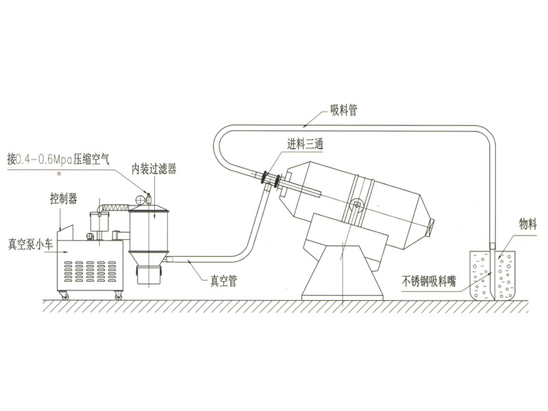 電動真空加料機由電動氣泵工作使密閉容積(如V型混合機、二維混合機、三維混合機等)產(chǎn)生真空即負壓,這樣真空加料機將通過輸料管從儲料倉中將物料吸入密閉容積內(nèi),再經(jīng)過過濾器將氣物分離,上料時間由PCB控制器決定,吸料結(jié)束,反吹裝置將反吹吸附在過濾器上的粉末,將粉末清除掉。下一個循環(huán)開始。